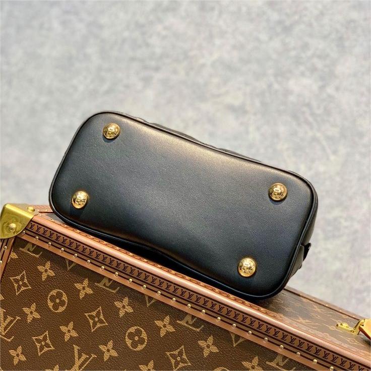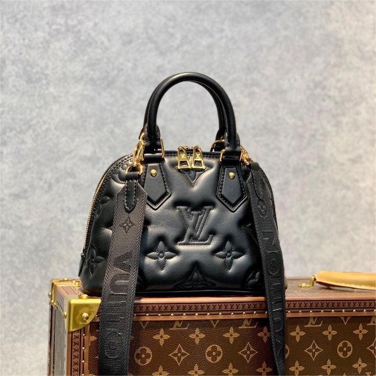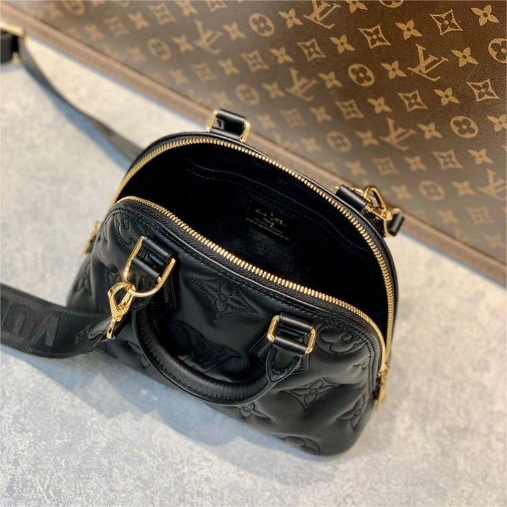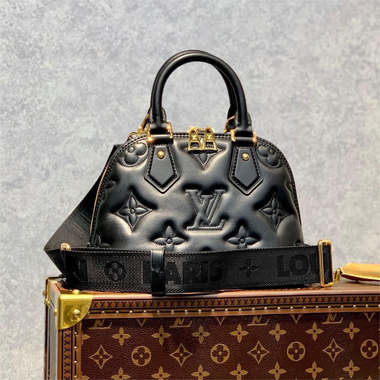 Made from quilted calfskin embroidered with the Monogram motif. the Alma BB handbag is the direct descendant of the Art Deco original from the 1930s. Crafted details like the two rolled-leather top handles complement the puffy leather. Equipped with a removable and adjustable strap. this small bag is perfect for cross-body wear in addition to hand carry.