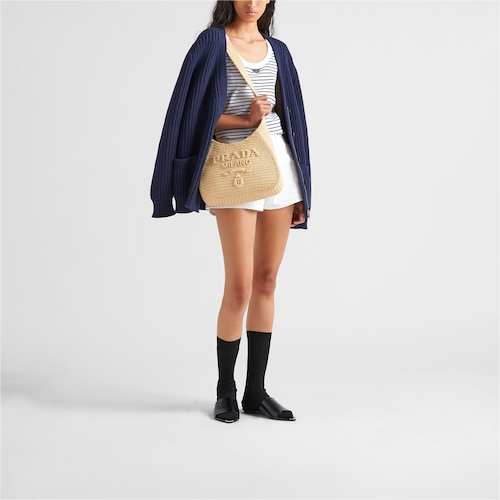 This maxi tote bag with a soft, deconstructed design is made of raffia-effect yarn, a light, natural material with a summery mood. The embroidered lettering logo decorates the front, while the emblematic enameled metal triangle logo embellishes the back.